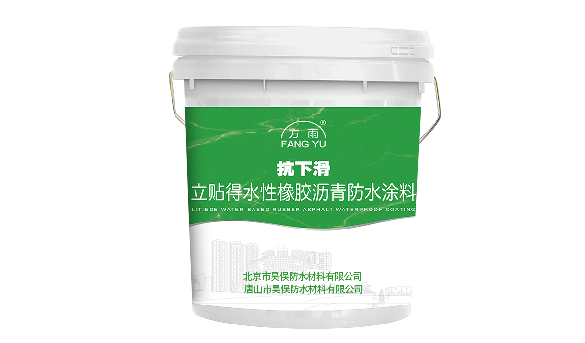 “方雨”牌“立贴得”水性橡胶沥青防水涂料是以优质沥青、丙烯酸酯、丁苯橡胶为基料,配以耐水助剂、抗紫外线剂、填料和多种功能助剂制成的,抗滑能力强,粘结力强的防水涂料。尤其适用于立墙施工。符合标准:JC/T864-2008《聚合物乳液建筑防水涂料》指标要求。
